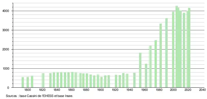 L'évolution du nombre d'habitants est connue à travers les recensements de la population effectués dans la commune depuis 1793. Pour les communes de moins de 10 000 habitants, une enquête de recensement portant sur toute la population est réalisée tous les cinq ans, les populations légales des années intermédiaires étant quant à elles estimées par interpolation ou extrapolation[29]. Pour la commune, le premier recensement exhaustif entrant dans le cadre du nouveau dispositif a été réalisé en 2004[30].