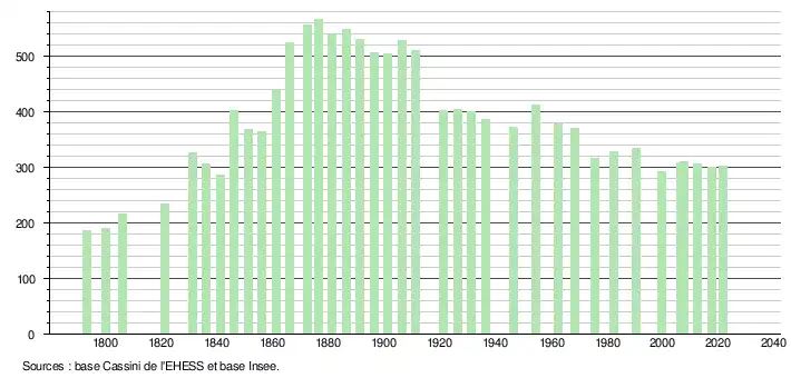 L'évolution du nombre d'habitants est connue à travers les recensements de la population effectués dans la commune depuis 1793. Pour les communes de moins de 10 000 habitants, une enquête de recensement portant sur toute la population est réalisée tous les cinq ans, les populations légales des années intermédiaires étant quant à elles estimées par interpolation ou extrapolation[18]. Pour la commune, le premier recensement exhaustif entrant dans le cadre du nouveau dispositif a été réalisé en 2007[19].