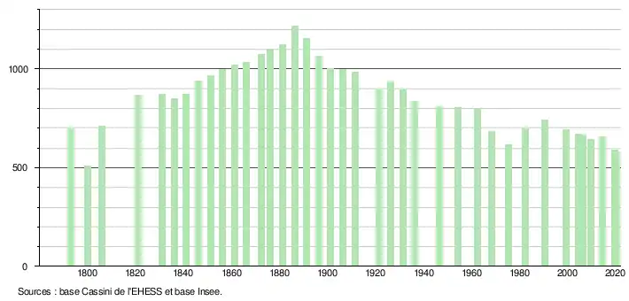 L'évolution du nombre d'habitants est connue à travers les recensements de la population effectués dans la commune depuis 1793. Pour les communes de moins de 10 000 habitants, une enquête de recensement portant sur toute la population est réalisée tous les cinq ans, les populations légales des années intermédiaires étant quant à elles estimées par interpolation ou extrapolation[21]. Pour la commune, le premier recensement exhaustif entrant dans le cadre du nouveau dispositif a été réalisé en 2004[22].