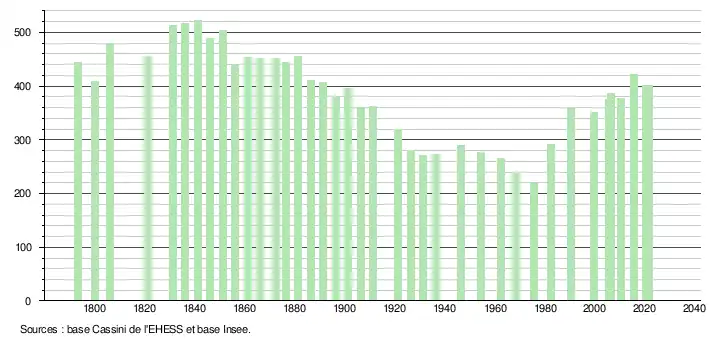 L'évolution du nombre d'habitants est connue à travers les recensements de la population effectués dans la commune depuis 1793. Pour les communes de moins de 10 000 habitants, une enquête de recensement portant sur toute la population est réalisée tous les cinq ans, les populations légales des années intermédiaires étant quant à elles estimées par interpolation ou extrapolation[23]. Pour la commune, le premier recensement exhaustif entrant dans le cadre du nouveau dispositif a été réalisé en 2005[24].