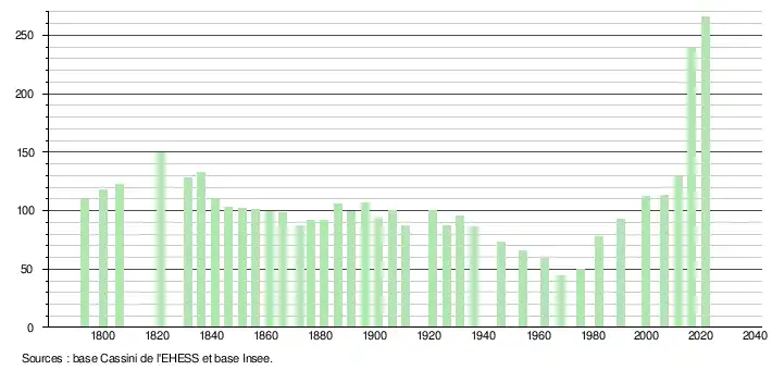 L'évolution du nombre d'habitants est connue à travers les recensements de la population effectués dans la commune depuis 1793. Pour les communes de moins de 10 000 habitants, une enquête de recensement portant sur toute la population est réalisée tous les cinq ans, les populations légales des années intermédiaires étant quant à elles estimées par interpolation ou extrapolation[20]. Pour la commune, le premier recensement exhaustif entrant dans le cadre du nouveau dispositif a été réalisé en 2006[21].