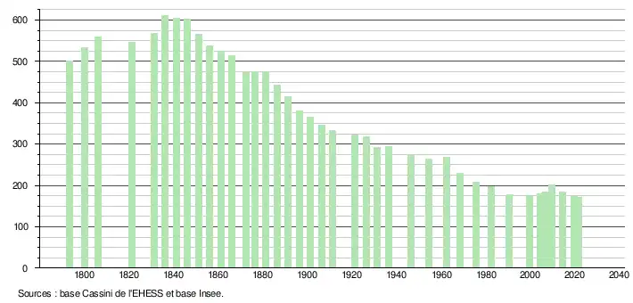 L'évolution du nombre d'habitants est connue à travers les recensements de la population effectués dans la commune depuis 1793. Pour les communes de moins de 10 000 habitants, une enquête de recensement portant sur toute la population est réalisée tous les cinq ans, les populations légales des années intermédiaires étant quant à elles estimées par interpolation ou extrapolation[16]. Pour la commune, le premier recensement exhaustif entrant dans le cadre du nouveau dispositif a été réalisé en 2004[17].