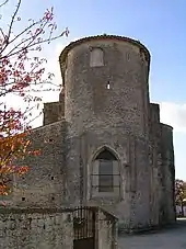 Le chevet a pris la forme d'une haute tour percée de meurtrières et d'archères dans toutes les directions. Le chœur et l'abside ont été rehaussés et leur partie basse a été murée pour en faire une tour fortifiée. En effet, l'exhaussement de l'abside qui est percée de deux niveaux d'archères a totalement obturé la face orientale du clocher arcade[22].