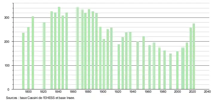 L'évolution du nombre d'habitants est connue à travers les recensements de la population effectués dans la commune depuis 1793. Pour les communes de moins de 10 000 habitants, une enquête de recensement portant sur toute la population est réalisée tous les cinq ans, les populations légales des années intermédiaires étant quant à elles estimées par interpolation ou extrapolation[18]. Pour la commune, le premier recensement exhaustif entrant dans le cadre du nouveau dispositif a été réalisé en 2007[19].