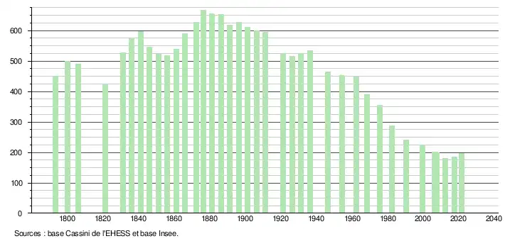 En décembre 1693, le dénombrement des paroissiens fut fait, à l’occasion d’une disette; le ministère fit faire chaque ménage la déclaration du nombre de grains qu’il y avait, blé seigle avoine et blé noir, pour y pouvoir; il se trouva 476 personnes, tant de grandes que d’enfants. En la présente, 1783, 31 décembre, il y a 422, compris le dernier-né L'évolution du nombre d'habitants est connue à travers les recensements de la population effectués dans la commune depuis 1793. Pour les communes de moins de 10 000 habitants, une enquête de recensement portant sur toute la population est réalisée tous les cinq ans, les populations légales des années intermédiaires étant quant à elles estimées par interpolation ou extrapolation[17]. Pour la commune, le premier recensement exhaustif entrant dans le cadre du nouveau dispositif a été réalisé en 2007[18].