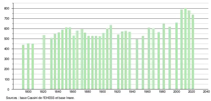 L'évolution du nombre d'habitants est connue à travers les recensements de la population effectués dans la commune depuis 1793. Pour les communes de moins de 10 000 habitants, une enquête de recensement portant sur toute la population est réalisée tous les cinq ans, les populations légales des années intermédiaires étant quant à elles estimées par interpolation ou extrapolation[24]. Pour la commune, le premier recensement exhaustif entrant dans le cadre du nouveau dispositif a été réalisé en 2006[25].