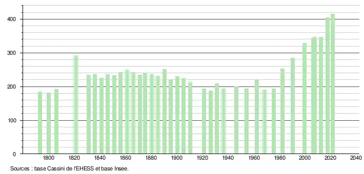 L'évolution du nombre d'habitants est connue à travers les recensements de la population effectués dans la commune depuis 1793. Pour les communes de moins de 10 000 habitants, une enquête de recensement portant sur toute la population est réalisée tous les cinq ans, les populations légales des années intermédiaires étant quant à elles estimées par interpolation ou extrapolation[16]. Pour la commune, le premier recensement exhaustif entrant dans le cadre du nouveau dispositif a été réalisé en 2007[17].