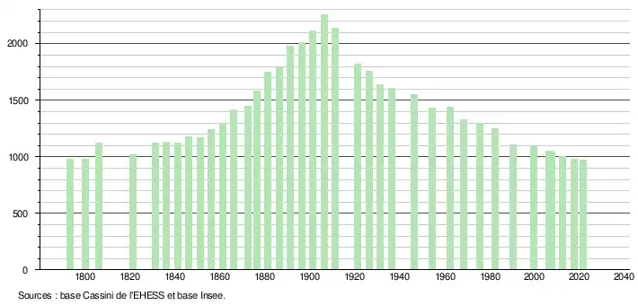 L'évolution du nombre d'habitants est connue à travers les recensements de la population effectués dans la commune depuis 1793. Pour les communes de moins de 10 000 habitants, une enquête de recensement portant sur toute la population est réalisée tous les cinq ans, les populations légales des années intermédiaires étant quant à elles estimées par interpolation ou extrapolation[25]. Pour la commune, le premier recensement exhaustif entrant dans le cadre du nouveau dispositif a été réalisé en 2007[26].