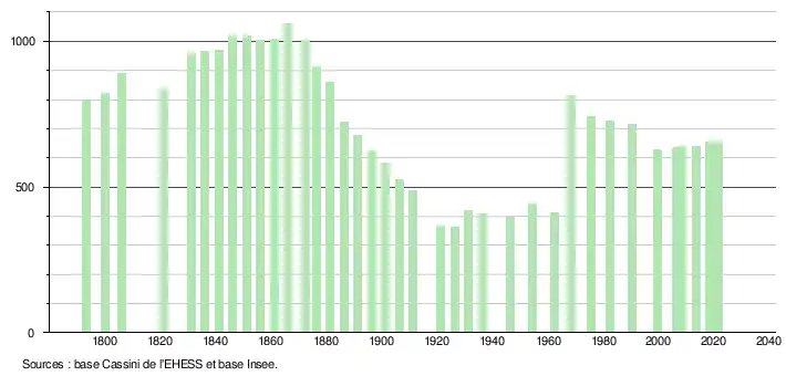 L'évolution du nombre d'habitants est connue à travers les recensements de la population effectués dans la commune depuis 1793. Pour les communes de moins de 10 000 habitants, une enquête de recensement portant sur toute la population est réalisée tous les cinq ans, les populations légales des années intermédiaires étant quant à elles estimées par interpolation ou extrapolation[20]. Pour la commune, le premier recensement exhaustif entrant dans le cadre du nouveau dispositif a été réalisé en 2008[21].