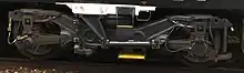 - Le , GWR a temporairement retiré 5 de ses class 800 de 5 voitures du service commercial après avoir découvert des craquelures dans l'amortisseur de lacet[57],[58]._leading_bogie.JPG.webp) Un bogie de class 800. La pièce blanche en haut est fixée à la caisse avec l'amortisseur triangulaire en dessous et la suspension en haut à droite. Un bogie de class 800. La pièce blanche en haut est fixée à la caisse avec l'amortisseur triangulaire en dessous et la suspension en haut à droite.