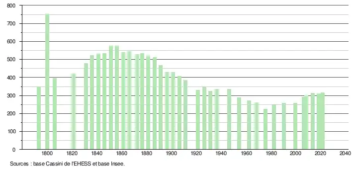L'évolution du nombre d'habitants est connue à travers les recensements de la population effectués dans la commune depuis 1793. Pour les communes de moins de 10 000 habitants, une enquête de recensement portant sur toute la population est réalisée tous les cinq ans, les populations légales des années intermédiaires étant quant à elles estimées par interpolation ou extrapolation[19]. Pour la commune, le premier recensement exhaustif entrant dans le cadre du nouveau dispositif a été réalisé en 2008[20].