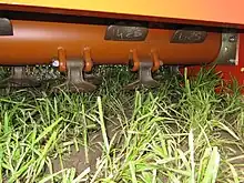 La prise de force du tracteur actionne l'axe horizontal d'un boitier de transmission qui transmet le mouvement de rotation à un arbre horizontal qui actionne un ensemble de courroie qui transmettent le mouvement au rotor. Sur ce rotor, sont fixés des couteaux en T ou en Y.