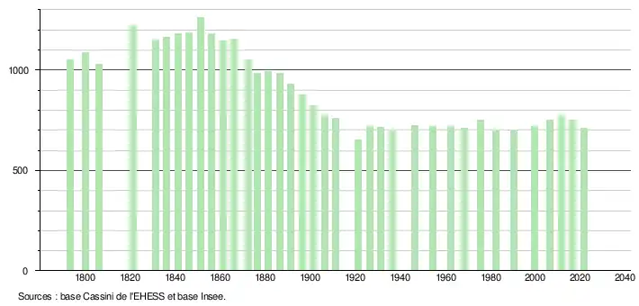 | L'évolution du nombre d'habitants est connue à travers les recensements de la population effectués dans la commune depuis 1793. Pour les communes de moins de 10 000 habitants, une enquête de recensement portant sur toute la population est réalisée tous les cinq ans, les populations légales des années intermédiaires étant quant à elles estimées par interpolation ou extrapolation[23]. Pour la commune, le premier recensement exhaustif entrant dans le cadre du nouveau dispositif a été réalisé en 2006[24]. En 2021, la commune comptait 710 habitants[Note 8], en diminution de 6,82 % par rapport à 2015 (Lot-et-Garonne : −0,66 %, France hors Mayotte : +1,84 %). |
