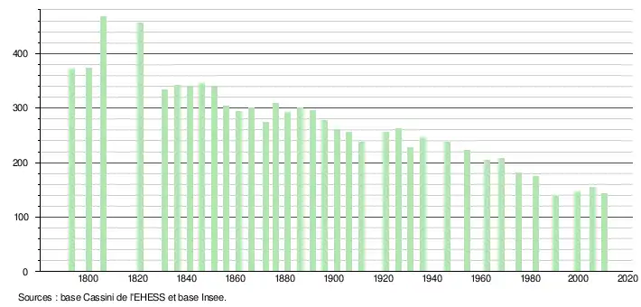 L'évolution du nombre d'habitants est connue à travers les recensements de la population effectués dans la commune depuis 1793. À partir du , les populations légales des communes sont publiées annuellement dans le cadre d'un recensement qui repose désormais sur une collecte d'information annuelle, concernant successivement tous les territoires communaux au cours d'une période de cinq ans. Pour les communes de moins de 10 000 habitants, une enquête de recensement portant sur toute la population est réalisée tous les cinq ans, les populations légales des années intermédiaires étant quant à elles estimées par interpolation ou extrapolation[14]. Pour la commune, le premier recensement exhaustif entrant dans le cadre du nouveau dispositif a été réalisé en 2005[15],[Note 2].