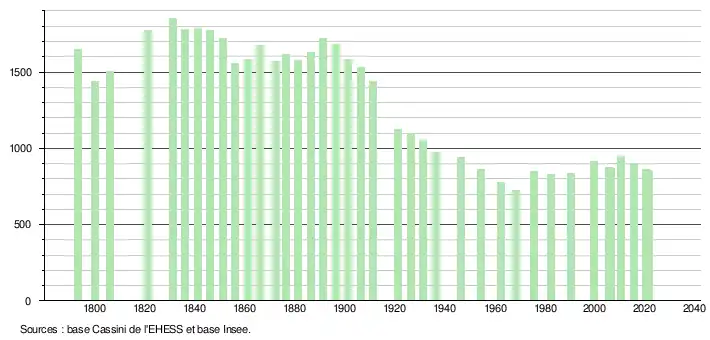L'évolution du nombre d'habitants est connue à travers les recensements de la population effectués dans la commune depuis 1793. Pour les communes de moins de 10 000 habitants, une enquête de recensement portant sur toute la population est réalisée tous les cinq ans, les populations légales des années intermédiaires étant quant à elles estimées par interpolation ou extrapolation[50]. Pour la commune, le premier recensement exhaustif entrant dans le cadre du nouveau dispositif a été réalisé en 2005[51].
