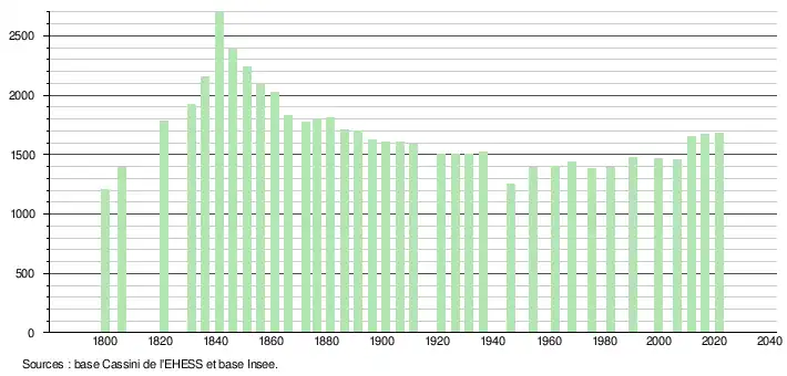 L'évolution du nombre d'habitants est connue à travers les recensements de la population effectués dans la commune depuis 1800. Pour les communes de moins de 10 000 habitants, une enquête de recensement portant sur toute la population est réalisée tous les cinq ans, les populations légales des années intermédiaires étant quant à elles estimées par interpolation ou extrapolation[22]. Pour la commune, le premier recensement exhaustif entrant dans le cadre du nouveau dispositif a été réalisé en 2006[23].