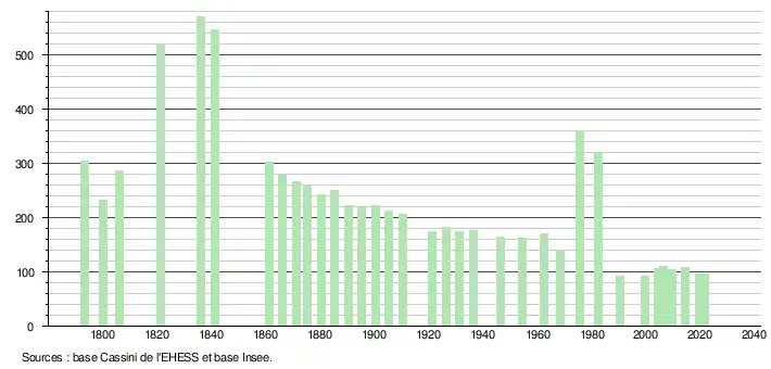 L'évolution du nombre d'habitants est connue à travers les recensements de la population effectués dans la commune depuis 1793. Pour les communes de moins de 10 000 habitants, une enquête de recensement portant sur toute la population est réalisée tous les cinq ans, les populations légales des années intermédiaires étant quant à elles estimées par interpolation ou extrapolation[20]. Pour la commune, le premier recensement exhaustif entrant dans le cadre du nouveau dispositif a été réalisé en 2004[21].