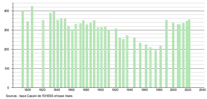 L'évolution du nombre d'habitants est connue à travers les recensements de la population effectués dans la commune depuis 1793. Pour les communes de moins de 10 000 habitants, une enquête de recensement portant sur toute la population est réalisée tous les cinq ans, les populations légales des années intermédiaires étant quant à elles estimées par interpolation ou extrapolation[27]. Pour la commune, le premier recensement exhaustif entrant dans le cadre du nouveau dispositif a été réalisé en 2008[28].