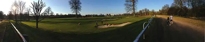 Image panoramique du Brussels Droh!me Golf Club avec, dans le fond, les anciennes tribunes de l'Hippodrome de Boitsfort[1].