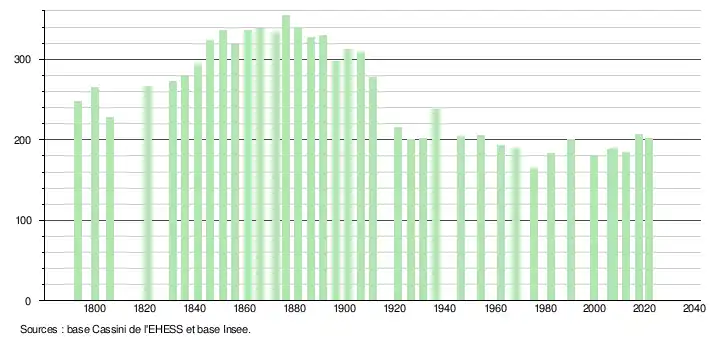 L'évolution du nombre d'habitants est connue à travers les recensements de la population effectués dans la commune depuis 1793. Pour les communes de moins de 10 000 habitants, une enquête de recensement portant sur toute la population est réalisée tous les cinq ans, les populations légales des années intermédiaires étant quant à elles estimées par interpolation ou extrapolation[23]. Pour la commune, le premier recensement exhaustif entrant dans le cadre du nouveau dispositif a été réalisé en 2007[24].