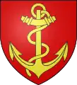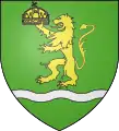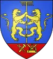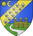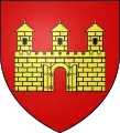 Blason | De gueules à la fasce ondée d'argent accompagnée en chef d'une forteresse crénelée sommée d'une tourelle crénelée et couverte d'or, maçonnée de sable, ouverte d'azur, et en pointe d'un château crénelé sommé de trois tourelles crénelées et couvertes d'or, ouvert de deux portes d'azur |