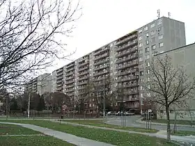 Dans les années d'après-guerre, le développement de Budapest ralentit significativement tandis que la part de travailleurs qualifiés et de professions intellectuelles augmente. Dans les années 1960, les travailleurs moins qualifiés venant de province n'ont plus les moyens de s'installer dans les quartiers centraux ou péricentraux et sont contraints de peupler les zones résidentielles périphériques. La crise de logement qui en découle contraint le pouvoir communiste à se lancer dans la construction de très vastes quartiers de grands ensembles autour des anciens villages de banlieue, désormais intégrés administrativement à Budapest. La priorité donnée à la construction de logements s'accompagne d'une dégradation progressive et de plus en plus soutenue des quartiers anciens, laquelle touche de manière particulièrement marquée les anciens faubourgs érigés avec des matériaux de moins bonne qualité, notamment dans les 13e, 8e et 9e arrondissements de Budapest.