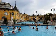 Pourvoyeuse de nombreuses sources d'eau thermale, Budapest débite 40 000 000 litres d'eau chaude et 30 000 000 litres d'eau tiède par jour. Ces sources sont à l'origine des établissements de bains et des thermes qui ont fait la réputation de la capitale. Le plus vaste ensemble de thermes souterrains au monde a été découvert à Budapest en 2008[16].
