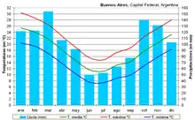 Le climat de Buenos Aires est tempéré, du type subtropical humide, la moyenne annuelle des températures étant de 17,6 °C. Le pays étant situé dans l'hémisphère Sud, les saisons en Argentine sont inversées par rapport à l'hémisphère Nord. L'été austral à Buenos Aires est chaud et ensoleillé malgré de possibles orages et les températures sont comprises entre 19 °C et 30 °C. L'hiver austral est doux et humide avec des températures comprises entre 7 °C et 16 °C.