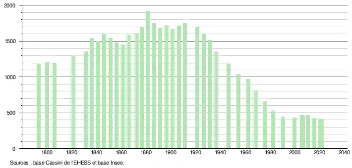 L'évolution du nombre d'habitants est connue à travers les recensements de la population effectués dans la commune depuis 1793. Pour les communes de moins de 10 000 habitants, une enquête de recensement portant sur toute la population est réalisée tous les cinq ans, les populations légales des années intermédiaires étant quant à elles estimées par interpolation ou extrapolation[39]. Pour la commune, le premier recensement exhaustif entrant dans le cadre du nouveau dispositif a été réalisé en 2005[40].