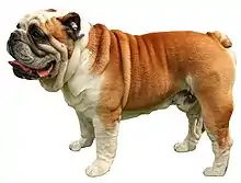 Le bouledogue ou bulldog anglais est une race de chien du type molosse. Le bulldog anglais (littéralement, en anglais, « chien-taureau ») est un chien trouvant naturellement son origine en Grande-Bretagne. Son apparition a été favorisée par le développement d'un sport apparu au XIIIe siècle : le combat entre chien et taureau désigné en anglais comme bullbaiting.