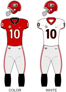 - Un uniforme unique a été porté en déplacement contre Florida en 2009. Cet uniforme comprenait un casque noir avec une grille de protection rouge, une bande blanche et le logo ovale traditionnel « G », un maillot blanc avec chiffres noirs et un pantalon noir[19] ;
