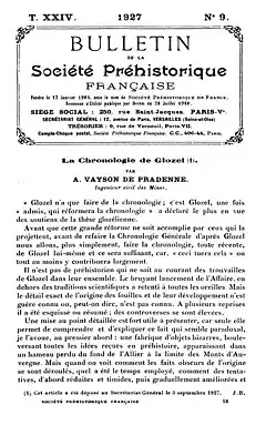 Première page du Bulletin de la Société préhistorique française de 1927, tome 24, no 9, et début d'un article d'André Vayson de Pradenne sur Glozel.