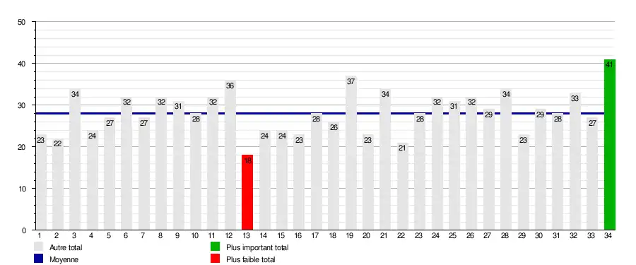 | Journées → | 1 | 2 | 3 | 4 | 5 | 6 | 7 | 8 | 9 | 10 | 11 | 12 | 13 | 14 | 15 | 16 | 17 | 18 | 19 | 20 | 21 | 22 | 23 | 24 | 25 | 26 | 27 | 28 | 29 | 30 | 31 | 32 | 33 | 34 | 1er | Barr. | Rel. |