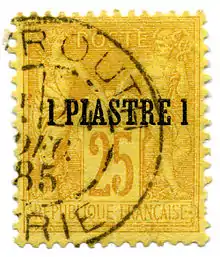 À partir de 1885, les timbres français avec des valeurs libellées en francs et centimes furent surchargés en monnaie locale (piastres et paras).