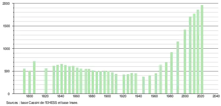 L'évolution du nombre d'habitants est connue à travers les recensements de la population effectués dans la commune depuis 1793. Pour les communes de moins de 10 000 habitants, une enquête de recensement portant sur toute la population est réalisée tous les cinq ans, les populations légales des années intermédiaires étant quant à elles estimées par interpolation ou extrapolation[44]. Pour la commune, le premier recensement exhaustif entrant dans le cadre du nouveau dispositif a été réalisé en 2006[45].