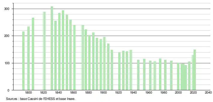 L'évolution du nombre d'habitants est connue à travers les recensements de la population effectués dans la commune depuis 1793. Pour les communes de moins de 10 000 habitants, une enquête de recensement portant sur toute la population est réalisée tous les cinq ans, les populations légales des années intermédiaires étant quant à elles estimées par interpolation ou extrapolation[16]. Pour la commune, le premier recensement exhaustif entrant dans le cadre du nouveau dispositif a été réalisé en 2004[17].