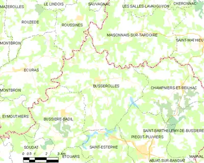 Busserolles est limitrophe de sept communes dont une en Haute-Vienne et deux en Charente.