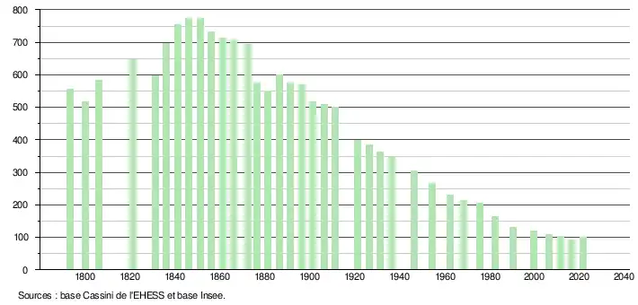 L'évolution du nombre d'habitants est connue à travers les recensements de la population effectués dans la commune depuis 1793. Pour les communes de moins de 10 000 habitants, une enquête de recensement portant sur toute la population est réalisée tous les cinq ans, les populations légales des années intermédiaires étant quant à elles estimées par interpolation ou extrapolation[27]. Pour la commune, le premier recensement exhaustif entrant dans le cadre du nouveau dispositif a été réalisé en 2006[28].