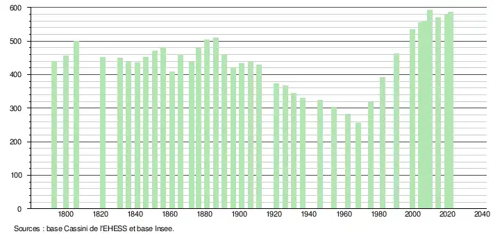 L'évolution du nombre d'habitants est connue à travers les recensements de la population effectués dans la commune depuis 1793. Pour les communes de moins de 10 000 habitants, une enquête de recensement portant sur toute la population est réalisée tous les cinq ans, les populations légales des années intermédiaires étant quant à elles estimées par interpolation ou extrapolation[19]. Pour la commune, le premier recensement exhaustif entrant dans le cadre du nouveau dispositif a été réalisé en 2004[20].