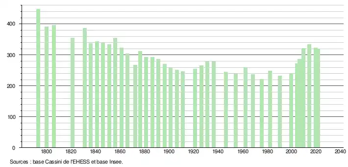 L'évolution du nombre d'habitants est connue à travers les recensements de la population effectués dans la commune depuis 1793. Pour les communes de moins de 10 000 habitants, une enquête de recensement portant sur toute la population est réalisée tous les cinq ans, les populations légales des années intermédiaires étant quant à elles estimées par interpolation ou extrapolation[25]. Pour la commune, le premier recensement exhaustif entrant dans le cadre du nouveau dispositif a été réalisé en 2004[26].