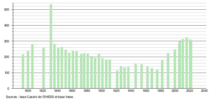 L'évolution du nombre d'habitants est connue à travers les recensements de la population effectués dans la commune depuis 1793. Pour les communes de moins de 10 000 habitants, une enquête de recensement portant sur toute la population est réalisée tous les cinq ans, les populations légales des années intermédiaires étant quant à elles estimées par interpolation ou extrapolation[28]. Pour la commune, le premier recensement exhaustif entrant dans le cadre du nouveau dispositif a été réalisé en 2005[29].
