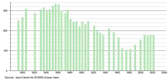 L'évolution du nombre d'habitants est connue à travers les recensements de la population effectués dans la commune depuis 1793. Pour les communes de moins de 10 000 habitants, une enquête de recensement portant sur toute la population est réalisée tous les cinq ans, les populations légales des années intermédiaires étant quant à elles estimées par interpolation ou extrapolation[21]. Pour la commune, le premier recensement exhaustif entrant dans le cadre du nouveau dispositif a été réalisé en 2006[22].