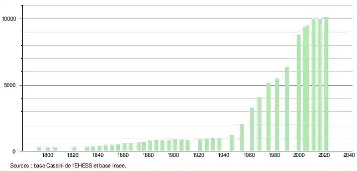 - Par convention dans Wikipédia, le principe a été retenu de n’afficher dans le tableau des recensements et le graphique, pour les populations légales postérieures à 1999, que les populations correspondant à une enquête exhaustive de recensement pour les communes de moins de 10 000 habitants, et que les populations des années 2006, 2011, 2016, etc. pour les communes de plus de 10 000 habitants, ainsi que la dernière population légale publiée par l’Insee pour l'ensemble des communes.