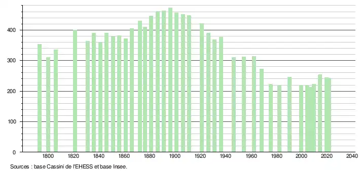 L'évolution du nombre d'habitants est connue à travers les recensements de la population effectués dans la commune depuis 1793. Pour les communes de moins de 10 000 habitants, une enquête de recensement portant sur toute la population est réalisée tous les cinq ans, les populations légales des années intermédiaires étant quant à elles estimées par interpolation ou extrapolation[30]. Pour la commune, le premier recensement exhaustif entrant dans le cadre du nouveau dispositif a été réalisé en 2004[31].