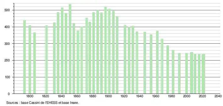 L'évolution du nombre d'habitants est connue à travers les recensements de la population effectués dans la commune depuis 1793. Pour les communes de moins de 10 000 habitants, une enquête de recensement portant sur toute la population est réalisée tous les cinq ans, les populations légales des années intermédiaires étant quant à elles estimées par interpolation ou extrapolation[33]. Pour la commune, le premier recensement exhaustif entrant dans le cadre du nouveau dispositif a été réalisé en 2005[34].