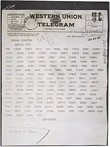 Le télégramme Zimmermann, télégramme diplomatique envoyé le par le ministre des Affaires étrangères de l'Empire allemand, Arthur Zimmermann, à l'ambassadeur d'Allemagne au Mexique, Heinrich von Eckardt, au plus fort de la Première Guerre mondiale. Compte tenu de son caractère confidentiel, il est chiffré.