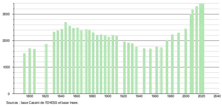 L'évolution du nombre d'habitants est connue à travers les recensements de la population effectués dans la commune depuis 1793. Pour les communes de moins de 10 000 habitants, une enquête de recensement portant sur toute la population est réalisée tous les cinq ans, les populations légales des années intermédiaires étant quant à elles estimées par interpolation ou extrapolation[23]. Pour la commune, le premier recensement exhaustif entrant dans le cadre du nouveau dispositif a été réalisé en 2008[24].