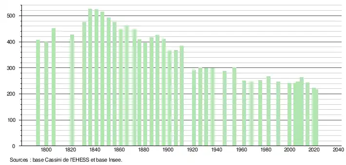 L'évolution du nombre d'habitants est connue à travers les recensements de la population effectués dans la commune depuis 1793. Pour les communes de moins de 10 000 habitants, une enquête de recensement portant sur toute la population est réalisée tous les cinq ans, les populations légales des années intermédiaires étant quant à elles estimées par interpolation ou extrapolation[14]. Pour la commune, le premier recensement exhaustif entrant dans le cadre du nouveau dispositif a été réalisé en 2004[15].