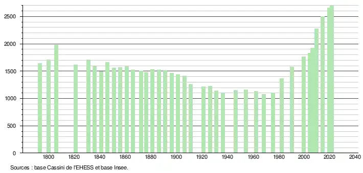 L'évolution du nombre d'habitants est connue à travers les recensements de la population effectués dans la commune depuis 1793. Pour les communes de moins de 10 000 habitants, une enquête de recensement portant sur toute la population est réalisée tous les cinq ans, les populations légales des années intermédiaires étant quant à elles estimées par interpolation ou extrapolation[30]. Pour la commune, le premier recensement exhaustif entrant dans le cadre du nouveau dispositif a été réalisé en 2004[31].