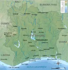La Côte d'Ivoire, en forme longue république de Côte d'Ivoire (RCI), est un État situé en Afrique, dans la partie occidentale du golfe de Guinée. Elle présente sensiblement la forme d'un carré d'environ 600 km de côté[7]. D'une superficie de 322 463 km2[8], elle est bordée au nord-ouest par le Mali, au nord-est par le Burkina Faso, à l'est par le Ghana, au sud-ouest par le Liberia, à l'Ouest par la Guinée et au sud par l'océan Atlantique. La population est estimée à 29 389 150 habitants en 2021[9].